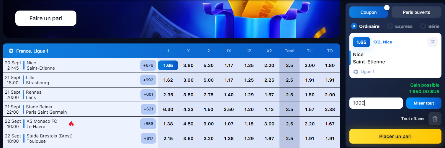 Le site 1win bet offre aux utilisateurs de nombreux avantages dans la section paris sportifs. Initialement, la société a commencé à fonctionner comme bookmaker. En France, les paris sont disponibles sur plus de 30 disciplines. Plus de 2 000 matchs y sont couverts chaque jour. Nous parlons principalement de ligues de haut niveau, mais elles couvrent parfois aussi des divisions mineures. Un processus de pari pratique et des bonus lucratifs sont les principaux avantages d'un bookmaker dans le pays.