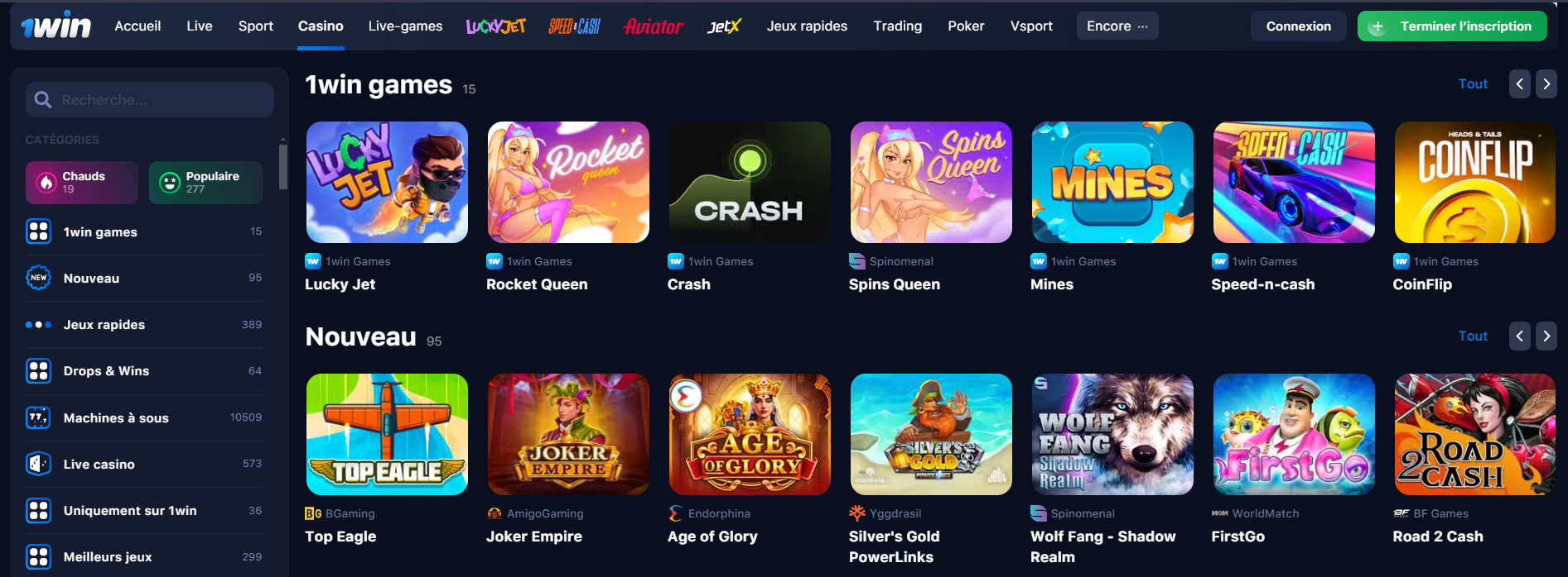 1win propose encore plus de jeux de casino en ligne sur dans la section Jeux instantanés. D'après son nom, vous pouvez deviner que ce genre offre un divertissement simple et rapide. Il n’y a pas de règles compliquées ni de longs tours. Habituellement, les jeux se succèdent et ne prennent pas plus de quelques minutes. Tout comme les machines à sous, ils ont leur propre RTP et des instructions détaillées. Les principales catégories d’aujourd’hui incluent :