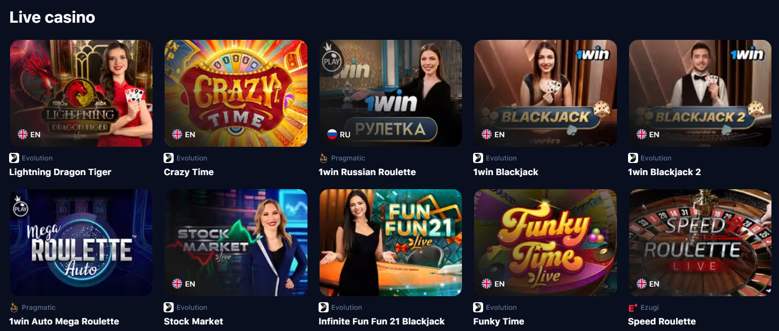Selon les clients de l'entreprise eux-mêmes, jouer à 1Win Fr au format Live apporte le plus d'émotions . Cette section contient des retransmissions en direct des studios équipés du monde entier. Lors de la connexion à l'émission, le joueur voit le présentateur, les accessoires et autres attributs nécessaires sur l'écran. Le gameplay ici est tout à fait conforme à celui d’un casino terrestre. La liste des divertissements de la catégorie ne cesse de s'allonger. Parmi les représentants les plus populaires du genre Live figuraient :